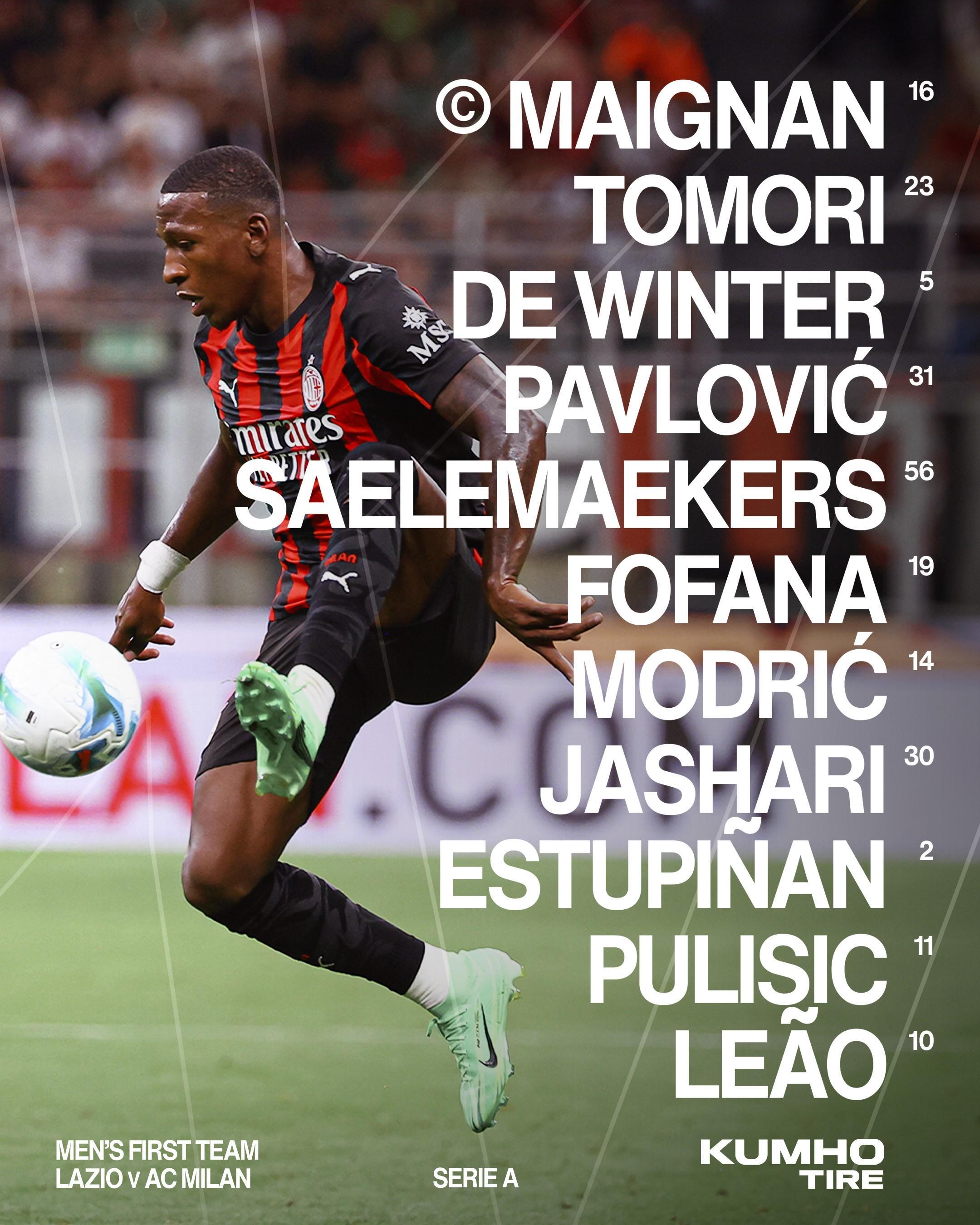 米兰首发:16-迈尼昂、23-托莫里、5-德温特、31-帕夫洛维奇、56-萨勒马克尔斯、19-优素福-福法纳、14-莫德里奇、30-亚沙里、2-埃斯图皮尼安、11-普利希奇、10-莱奥
